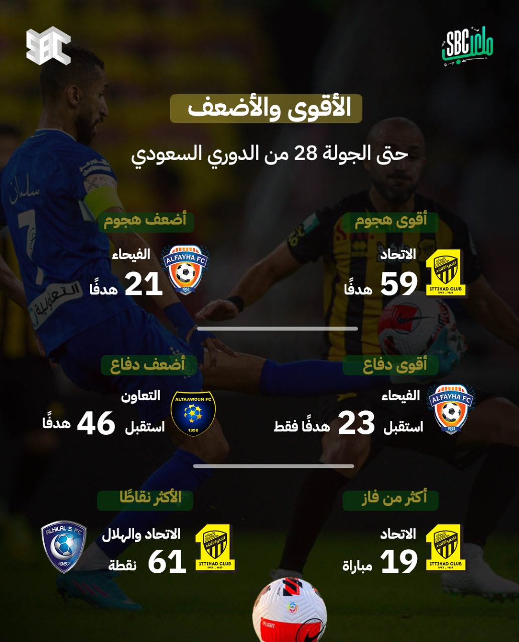 يمتلك الاتحاد أقوى هجوم برصيد 59 هدفًا، بينما يمتلك الفيحاء أقوى دفاع لاستقباله 23 هدفًا فقط حتى الآن.